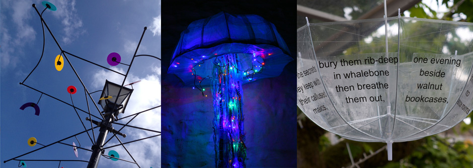 Sculptor Gillian Brent, artist Carine Brosse and poet Becky Cherriman were commissioned to create new large-scale outdoor artworks. The installations responded to ‘umbrella’ as a theme. Local shops and businesses redesigned and dressed up their windows displays to accompany the theme.