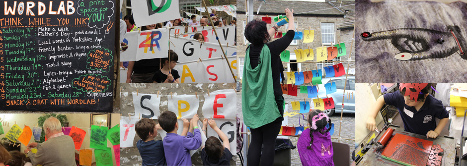 An artist-led print space facility open for public to “think while you ink”, encouraging them to pause and create. WordLab was a printing facility and installation fostering curiosity in words and language in a new playful format led by artist Helen Peyton. Offering workshops for the older generations in care homes, families, adults and school children to examine various print techniques. Including an interactive outdoor installation of printed letters and words for participatory games evoking thought about the ways we share ideas, messages and stories and a community challenge based around word games and a huge word search treasure hunt around the village. With thanks to Helen Peyton, Carine Brosse, Jennyanne Smith, Rachel Errington, Monika Laskowska and Lucia Ovejero.