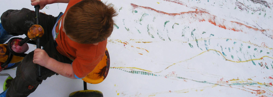A outdoor family fun day on Fathers’ Day with wheels, tyres, giant paper and a heck of a lot of paint. We explored different mark making on a big scale. Wheels were kindly donated by the public and sourced from Threshfield Garage.
